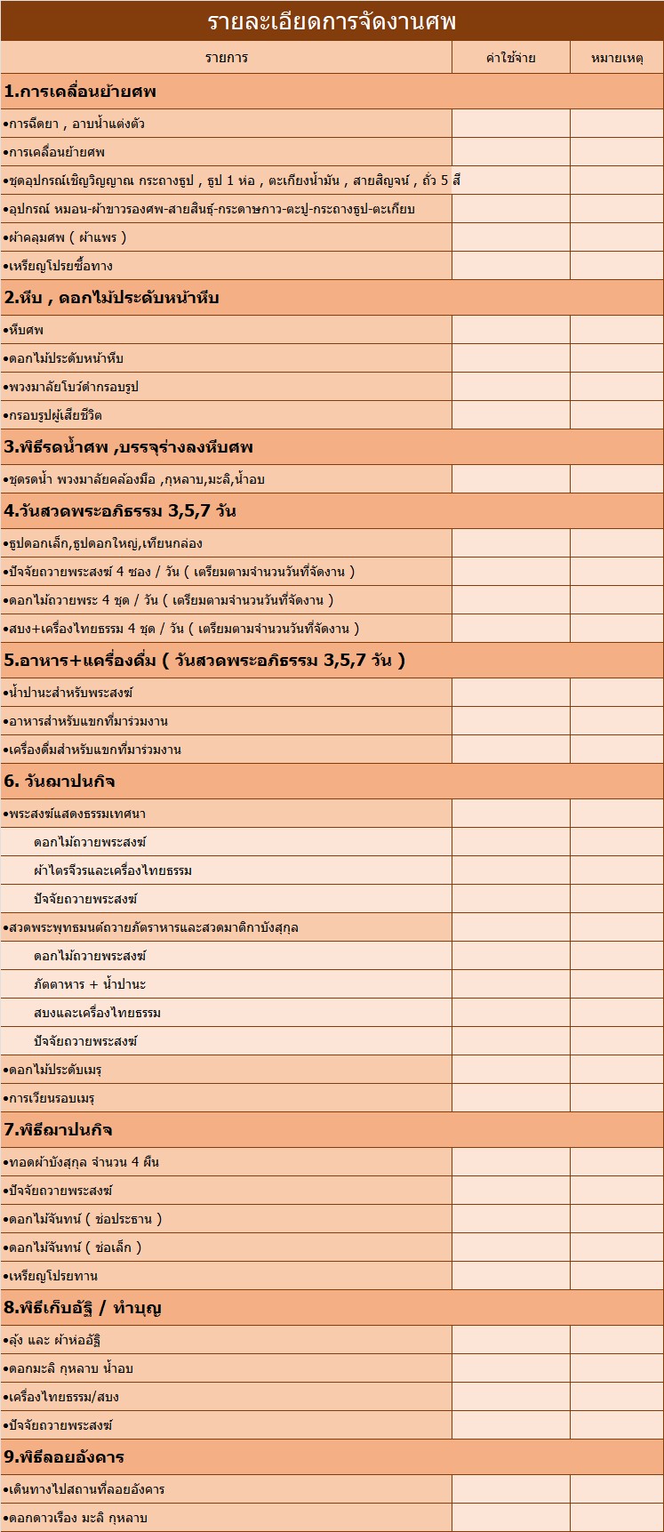 วันนี้ดอกไม้สวยปทุมทำราคาที่อยู่ในระดับปานกลางของการจัดงานศพหนึ่งงานให้กับลูกค้าดูเป็นตัวอย่างและพร้อมกับแนบตารางที่ลูกค้าสามารถจะนำไปลงรายละเอียดเพิ่มเติมเพื่อเป็นการรีเช็ครายการจัดงานทำให้สามารถที่จะคำนวณค่าใช้จ่าย ให้เห็นภาพล่วงหน้า เพื่อสำหรับการวางแผนการจัดงานให้ราบรื่นค่ะ